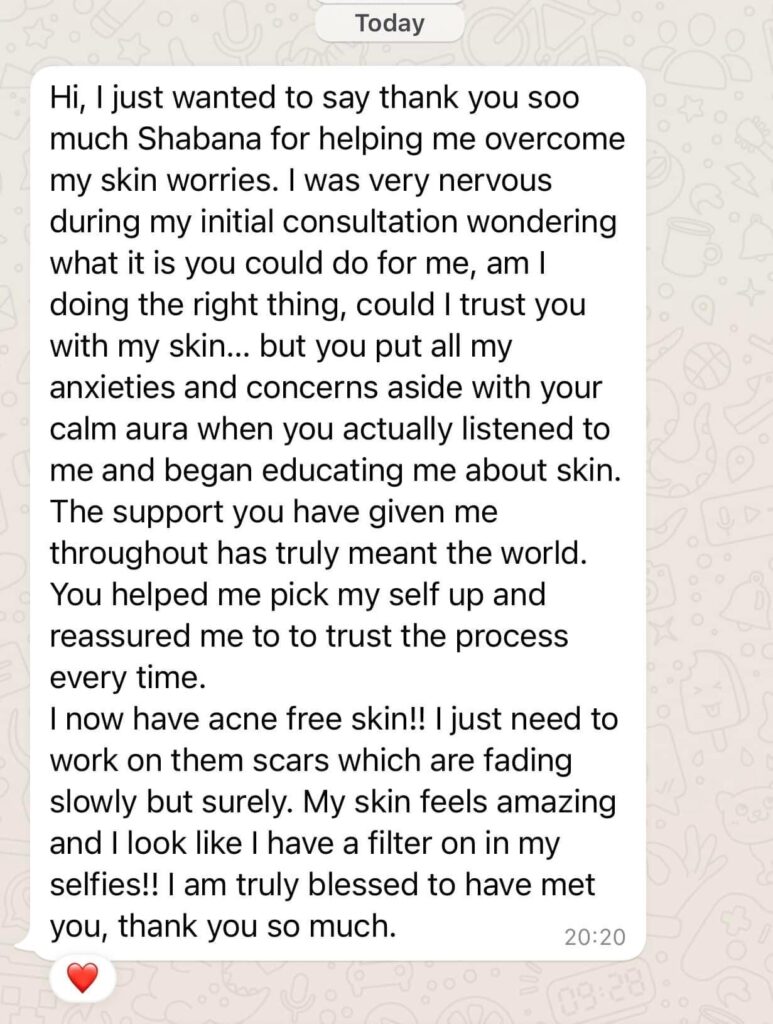 Since coming to see shabana, I have seen such an improvement in my skin and I feel much more confident! I’m not having to cover up with makeup too much anymore either.
